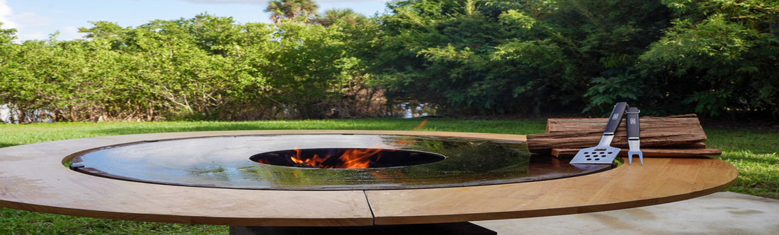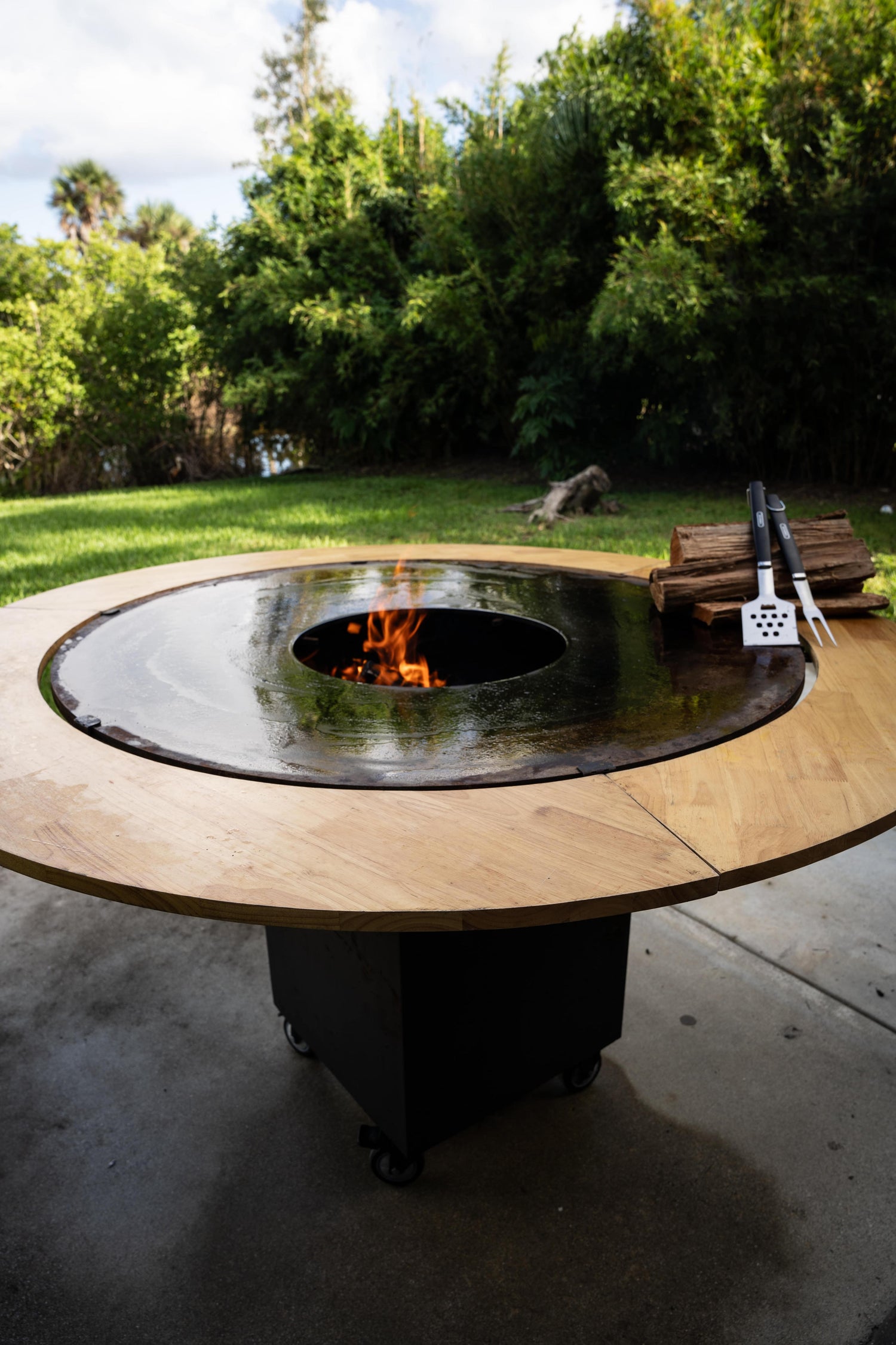 The COMMANDER Series redefines outdoor grilling with unmatched craftsmanship and performance. Available in two models, the COMMANDER 850 with its 33-inch round carbon steel cooking plate and the COMMANDER 1000 with a larger 39-inch plate, these grills are designed to bring people together. Each unit features a solid ½-inch thick beveled carbon steel cooking plate that directs grease toward the central fire hole for easy cleanup, while the sturdy base cabinet and fire bowl are built from heavy-duty steel and finished in sleek black.